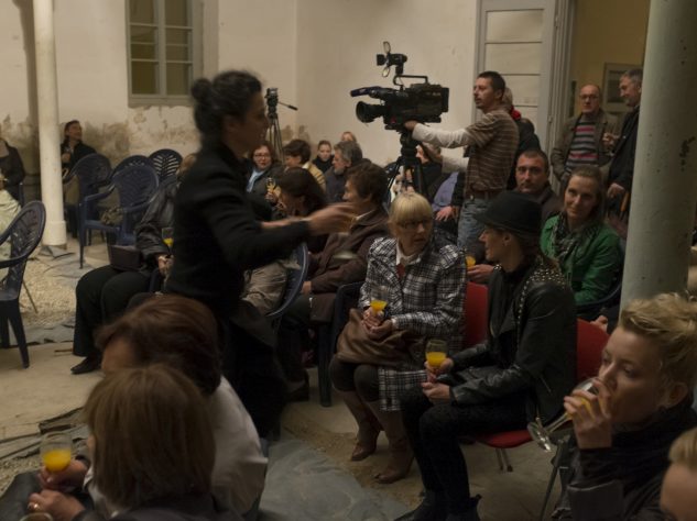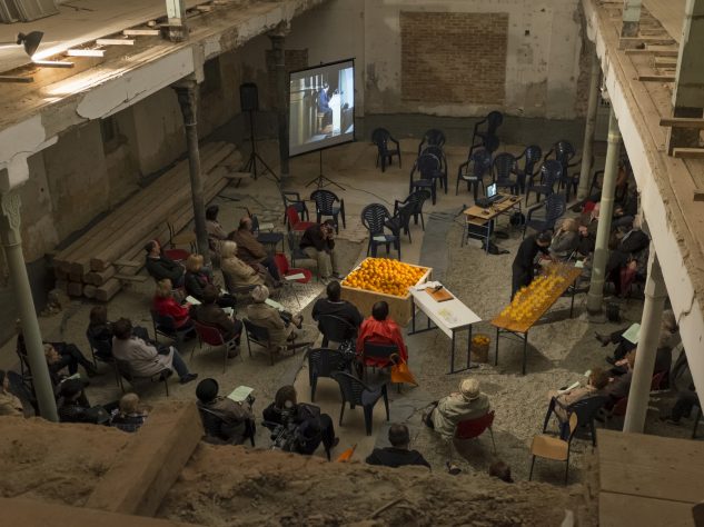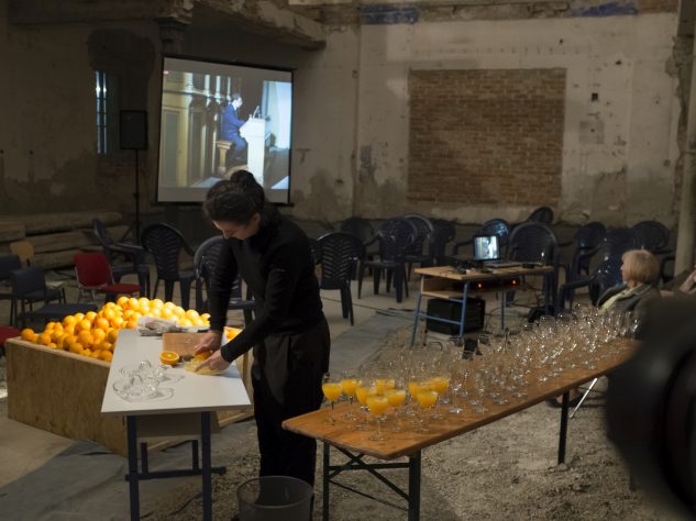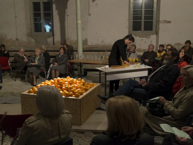 In the empty Church of St Anthony of Padua, the camera shoots PavaoMašić playing on the organ. Image and sound are transmitted live via Web streaming to a large screen put up in Koprivnica Old Synagogue. In the midst of the synagogue, a thousand oranges are glimmering. Pavao is playing. A hundred or so people are sitting in the penumbra. I am squeezing the oranges. The air is redolent of their scent. The pure, clear sound of the organ is in the ether. On my right is a big picture of Pavao on the screen… Before us, there are forty five minutes for a new beginning. Six compositions for organ, a hundred glasses of fresh juice. And then, the playing stops. I leave the oranges alone, wipe my hands, take up a glass, and approach the people. I treat each person individually with freshly squeezed orange juice. I bring the evening to an end. At the way out of the synagogue, I say farewell to the people as they leave. End of performance.